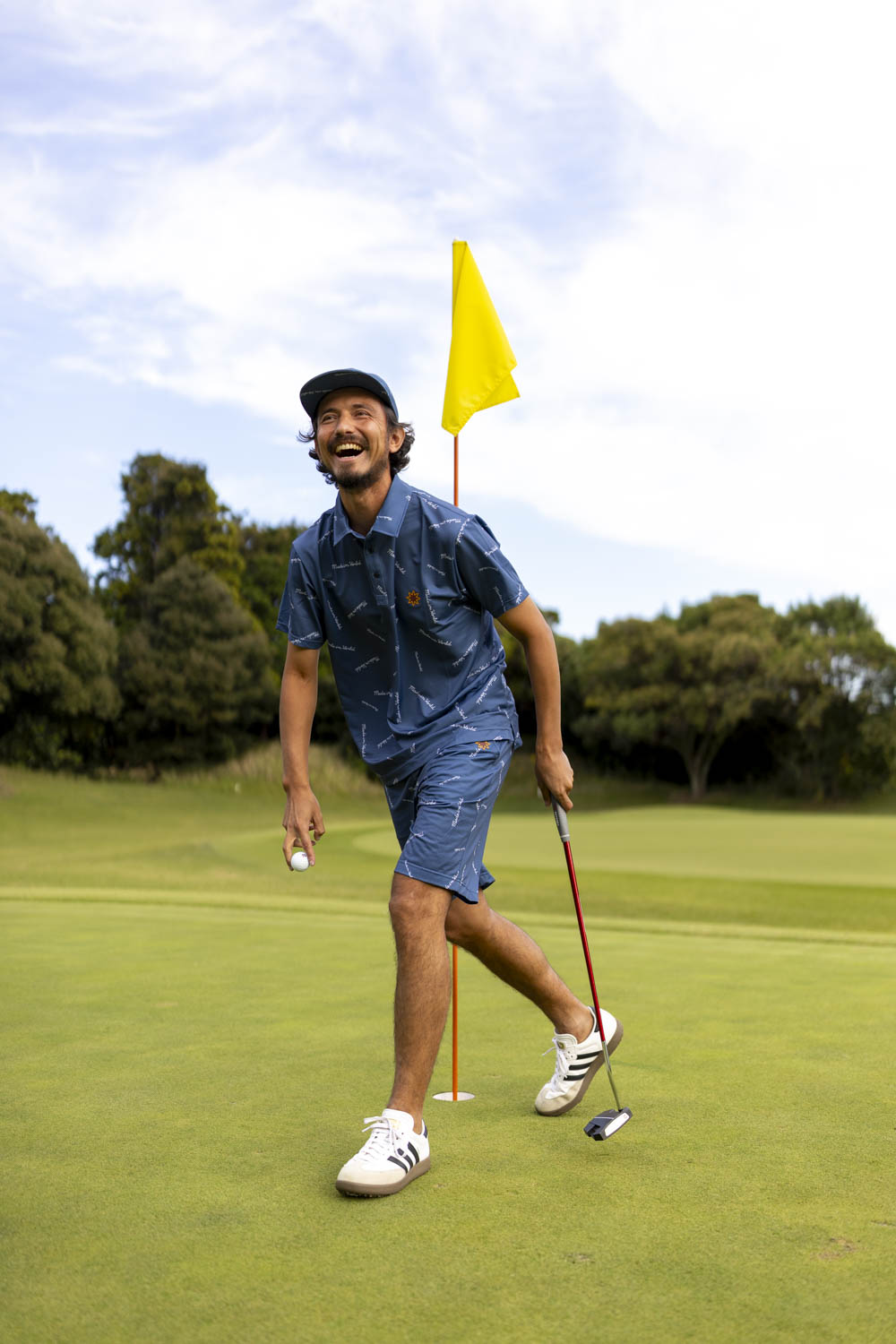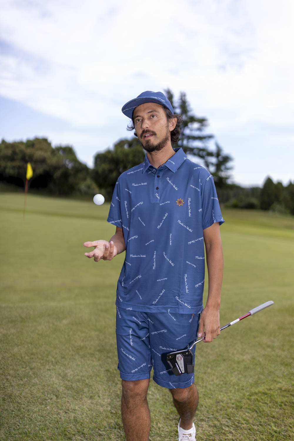 安全のあるブルーカラーをベースに、「Made in world」「Miw Golf」などのロゴを総柄デザイン。シンプルなスタイリングにも映える存在感がありながら、落ち着いた上品でまとまっています。